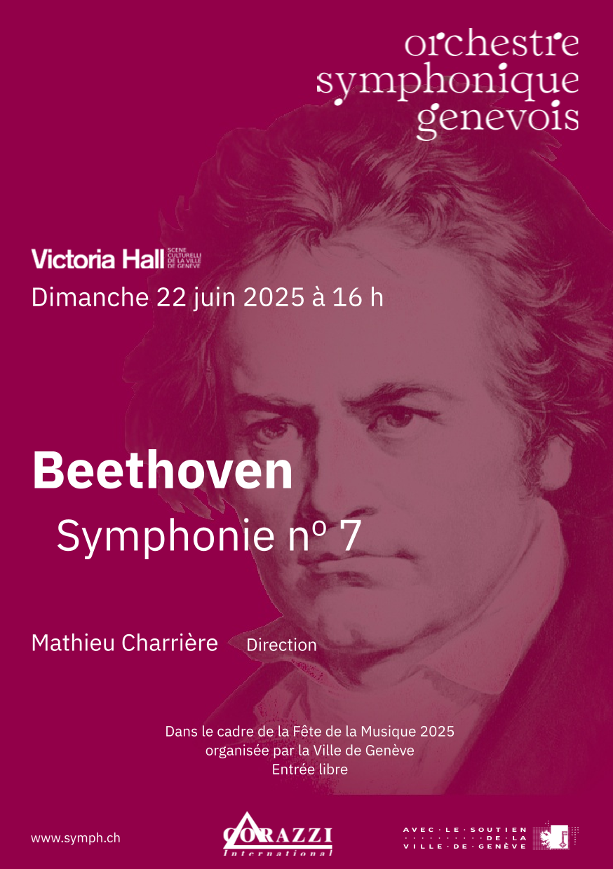 Victoria Hall Rue du Général-Dufour 14, GenèveConcert dans le cadre de la Fête de la Musique 2025 organisée par la Ville de Genève, du 20 au 22 juin 2025. Beethoven, Symphonie N° 7 Direction : Mathieu …